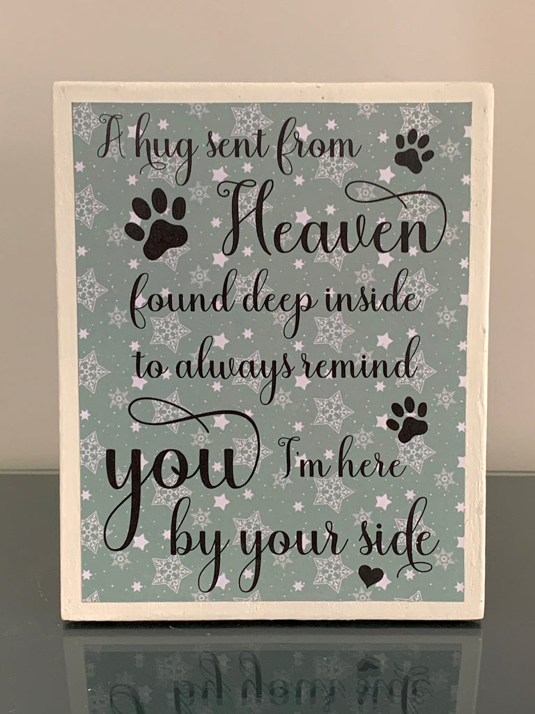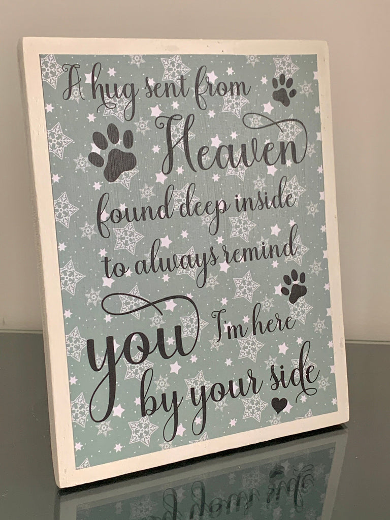 A hug sent from Heaven found deep inside to always remind you I'm here by your side. Pet memorial wooden plaque. 19 cm x 16 cm.
