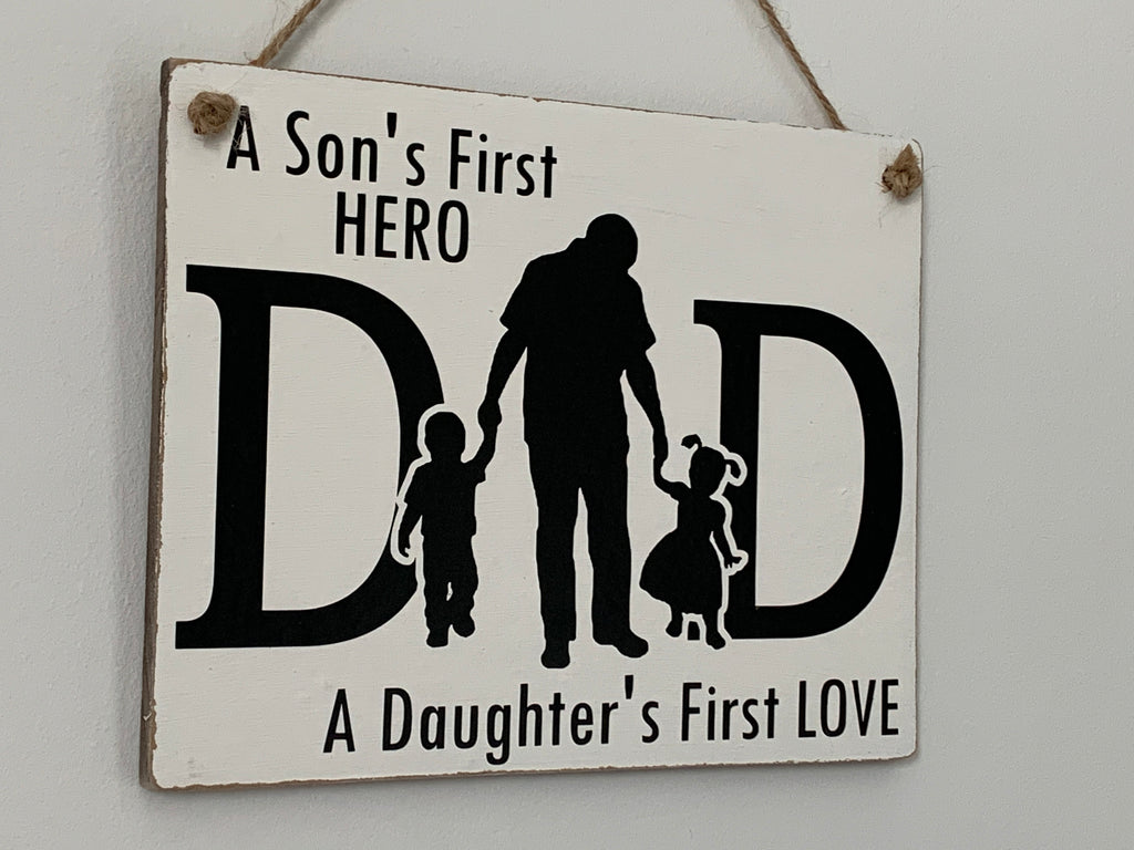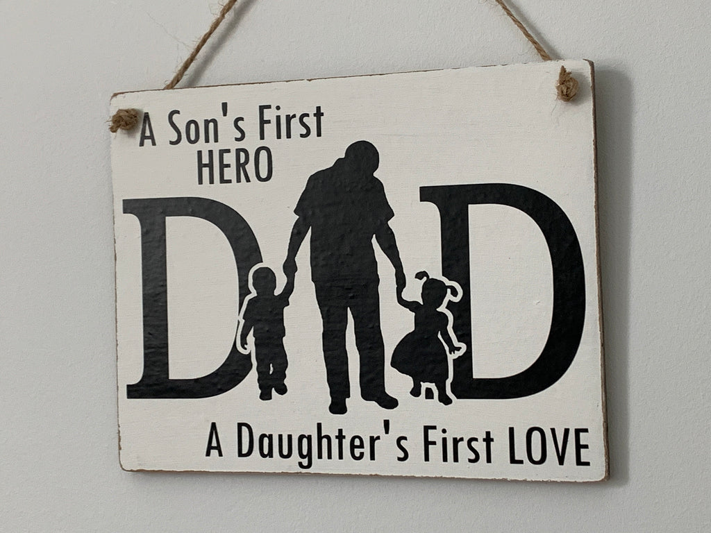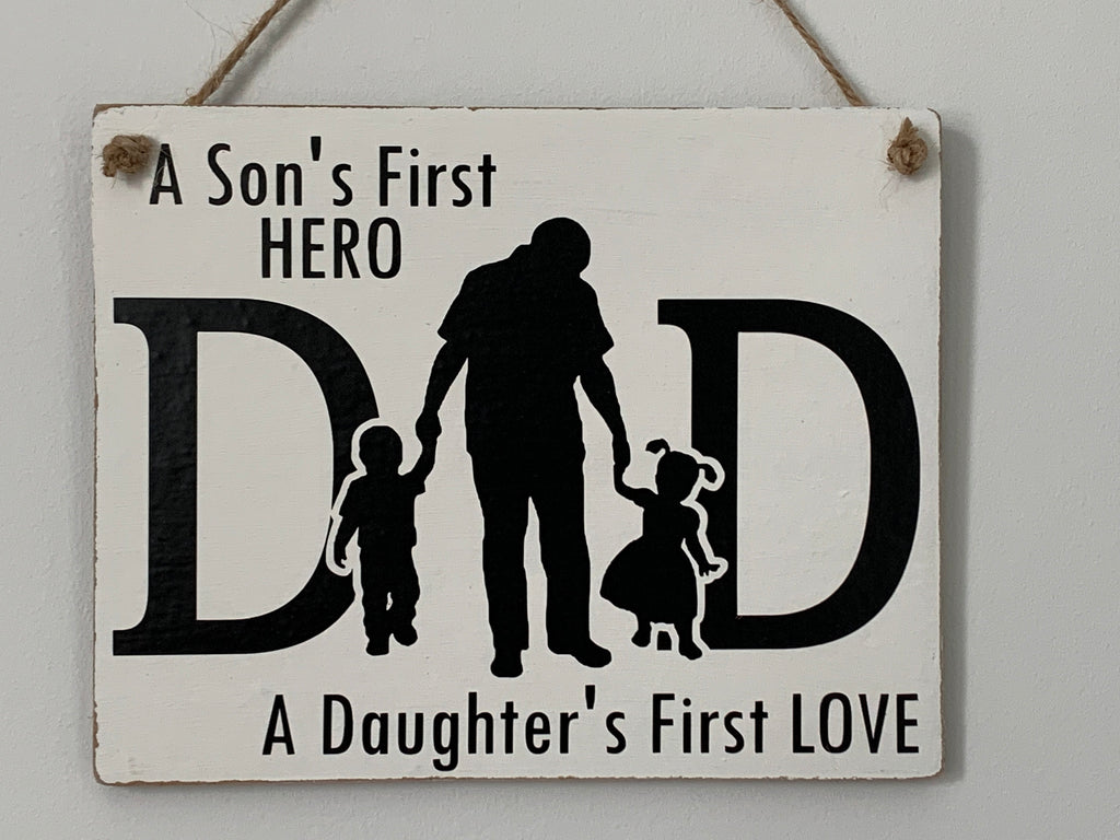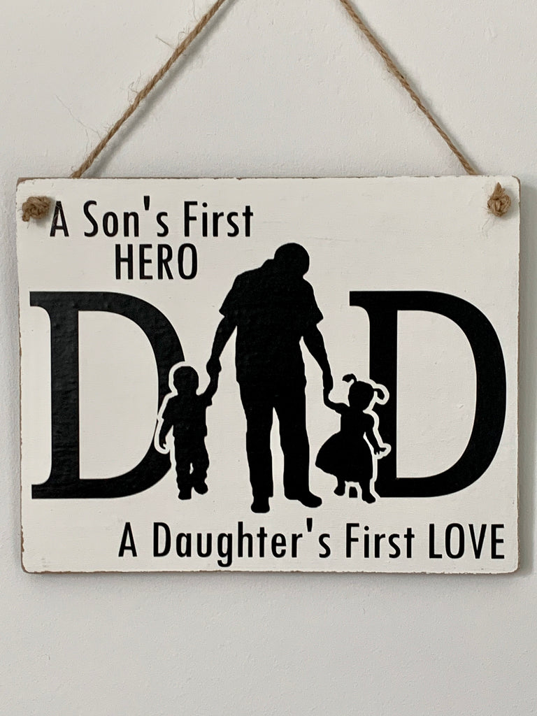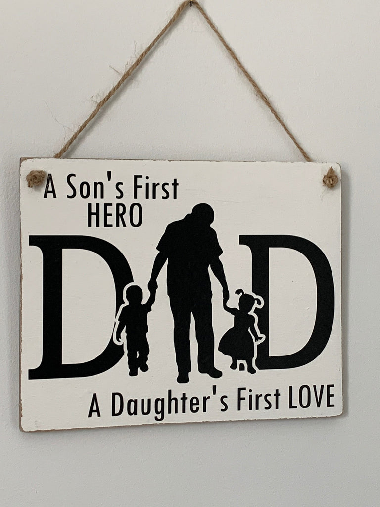A Son's First Hero A Daughter's First LOVE, Dad Gift, Dad Sign, Wall Hanging Sign, Home Decoration. Family Sign, 19 cm x 16 cm Hanging Sign