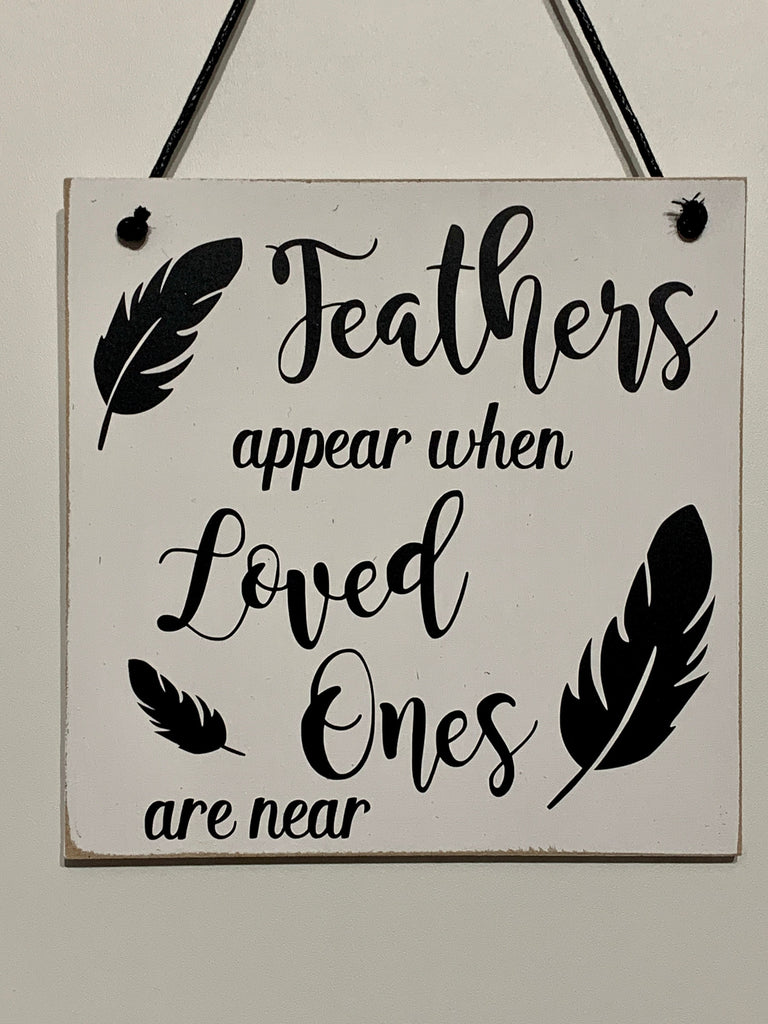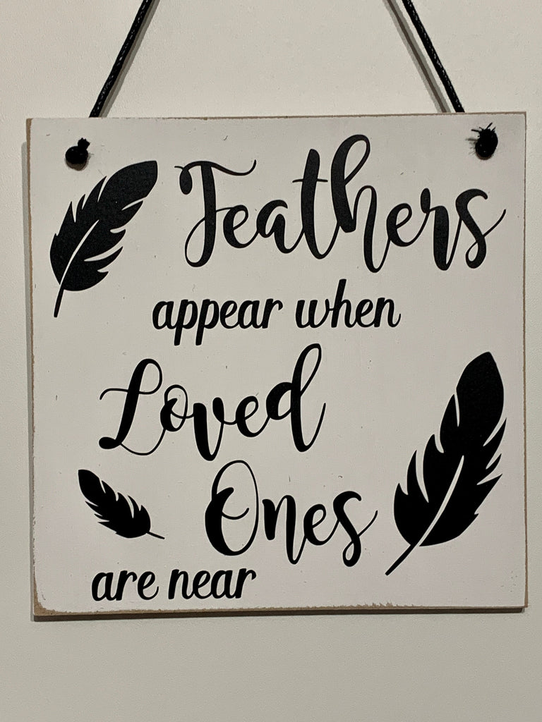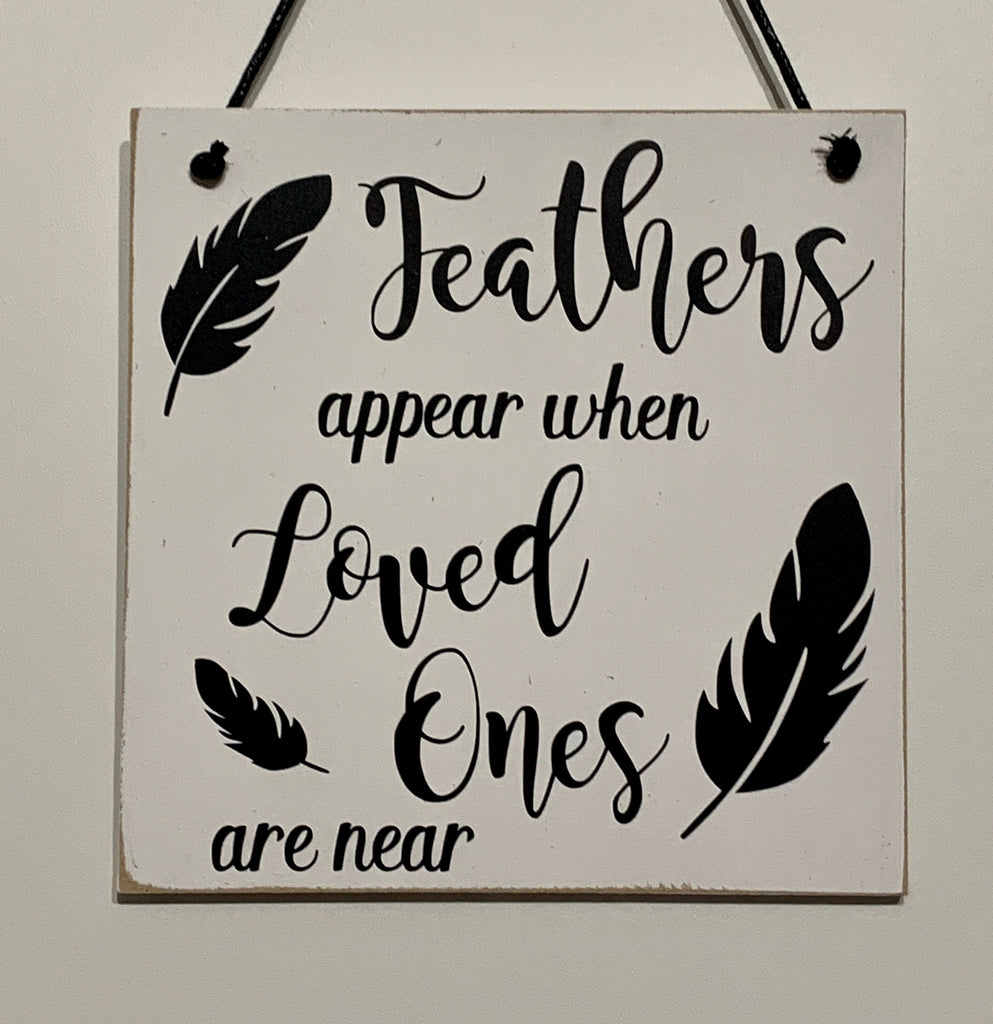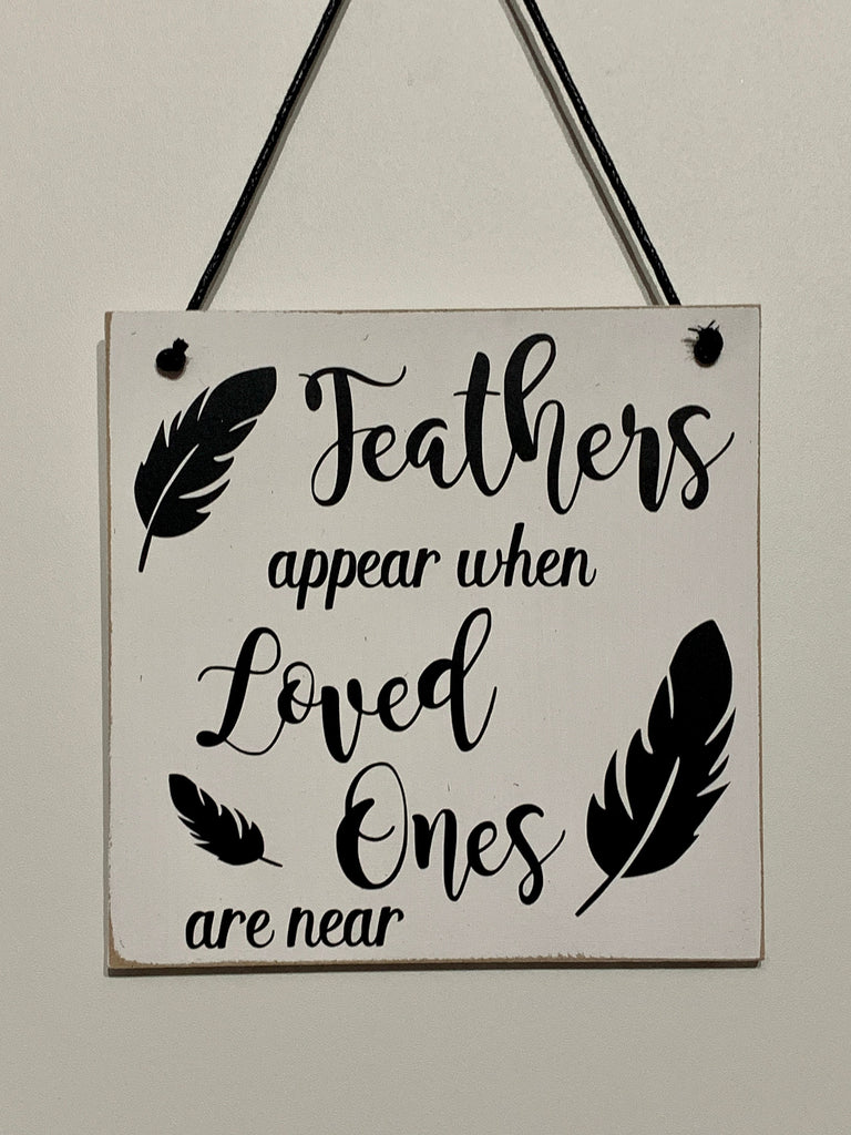 Feathers appear when Loved Ones are near. Memorial Sign, Wall Hanger, Wooden Sign, 15 cm x 15 cm. Home decoration.