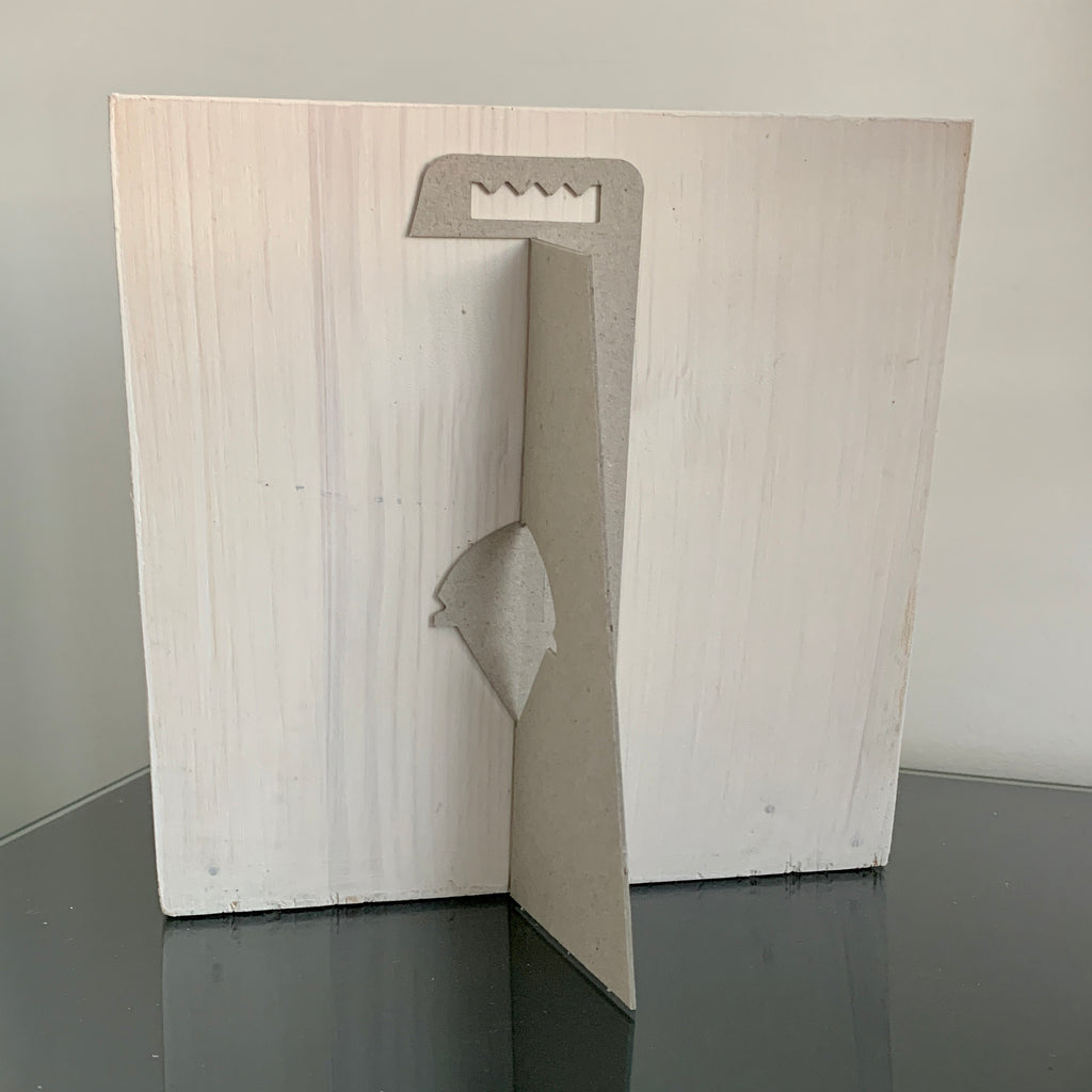 This wooden block measure 19cm high x 19cm wide and has a stand at the back...although it will stand alone too.