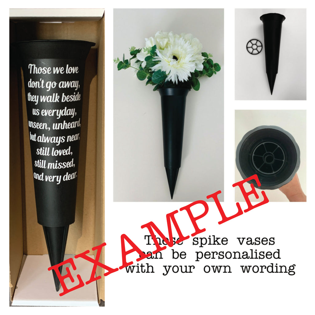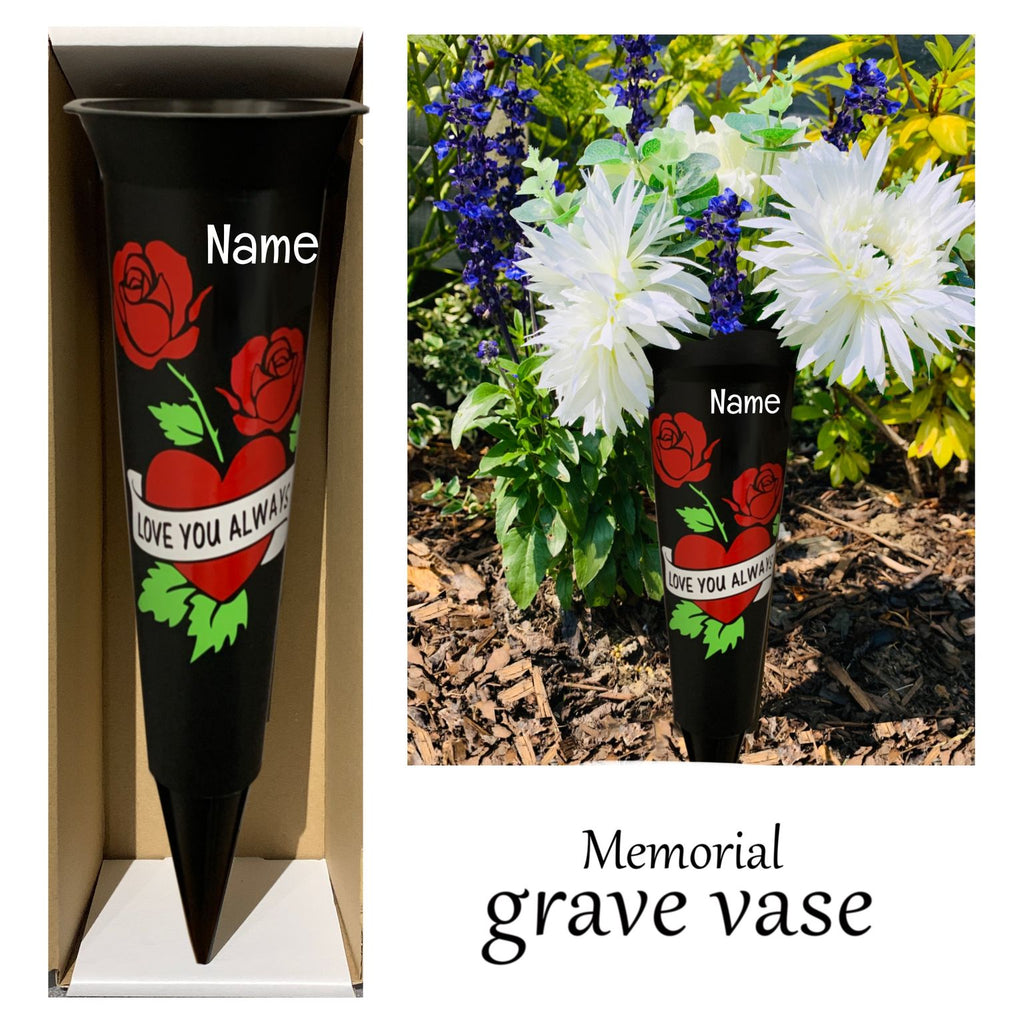 Grave Marker & Decoration | A Much Loved | Personalised Graveside Pot | Funerals/Bereaved A Much Loved (choose name) Funerals Vase These plastic vases measure approximately 33cm high x 10cm diameter. Very sturdy ornamental vase with good sized spike for stability. Complete with a plastic grate for arranging your own flowers. You can choose from the vinyl colour chart displayed in the image gallery. You will receive the vase complete with your personalised sticker attached so all you have to do is fill with flowers (flowers not included). Free UK Delivery. |