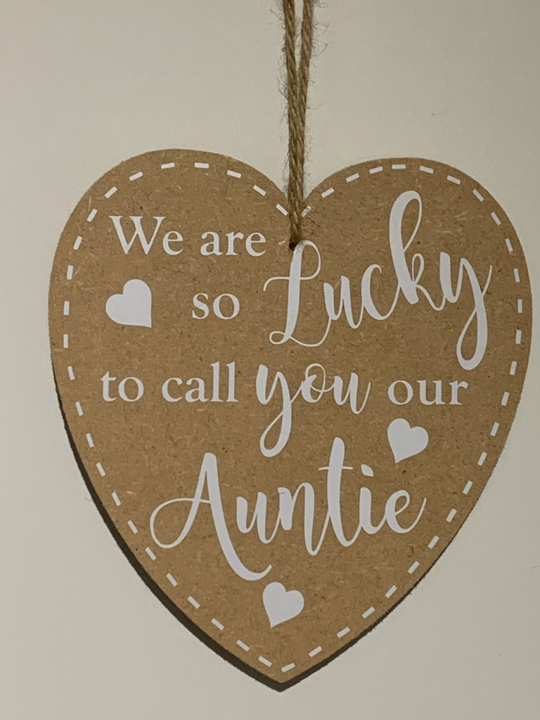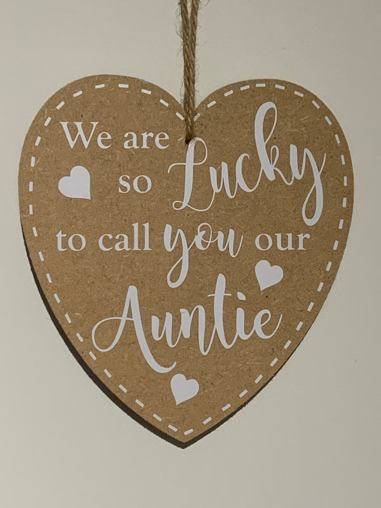 Item Description We are so lucky to call you our Auntie. A wooden heart sign made of mdf and measure 16cm x 15cm. With a jute string Hanger. These make beautiful gifts for any occasion, Birthday, Christmas etc. Please note the back of these plaques are plain mdf. FREE UK POST |