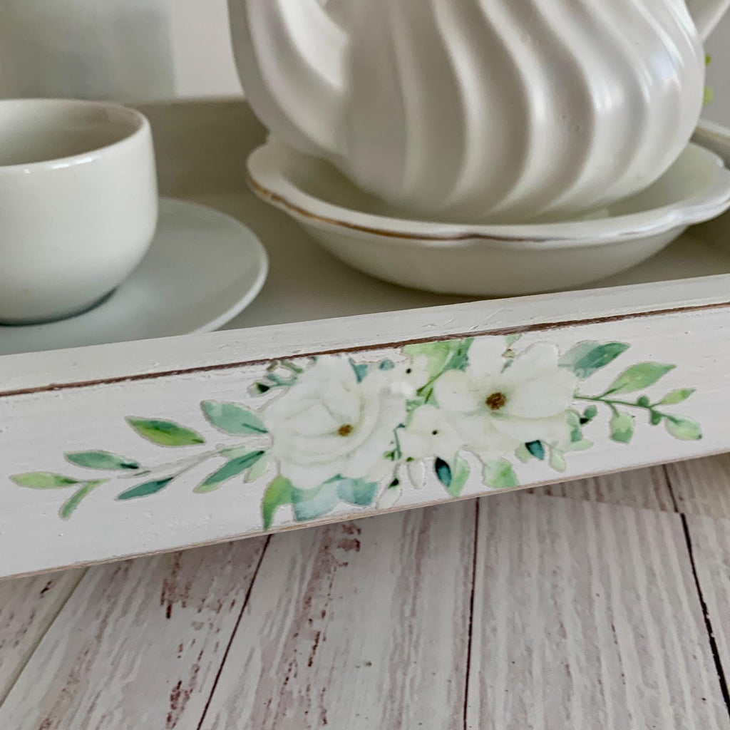 The stunning tray is made from a solid wood and coated in a distressed white chalk paint. The front adorns a beautiful flower and eucalyptus design.
