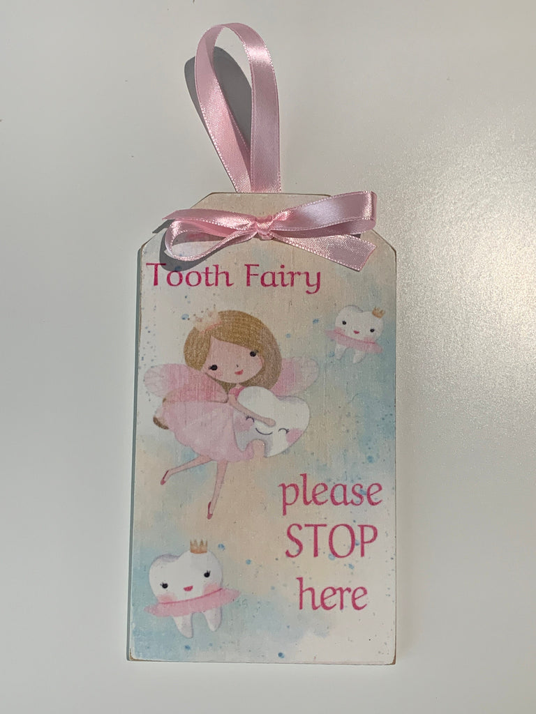 Door Hangers, Tooth Fairy sign, Please Stop Here Sign, 16 cm x 9 cm, Wooden hanger, Pink ribbon - Free Tooth Bag 12 cm x 9.5 cm