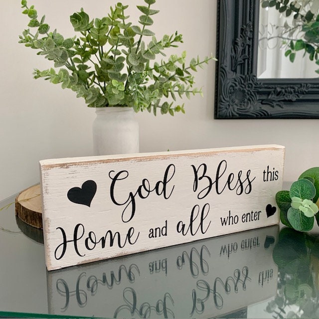 God bless this home and all who enter. Wooden sign. Home decoration, New Home Gift, Moving in Gift, 29 cm, Tier Shelf Sitter.