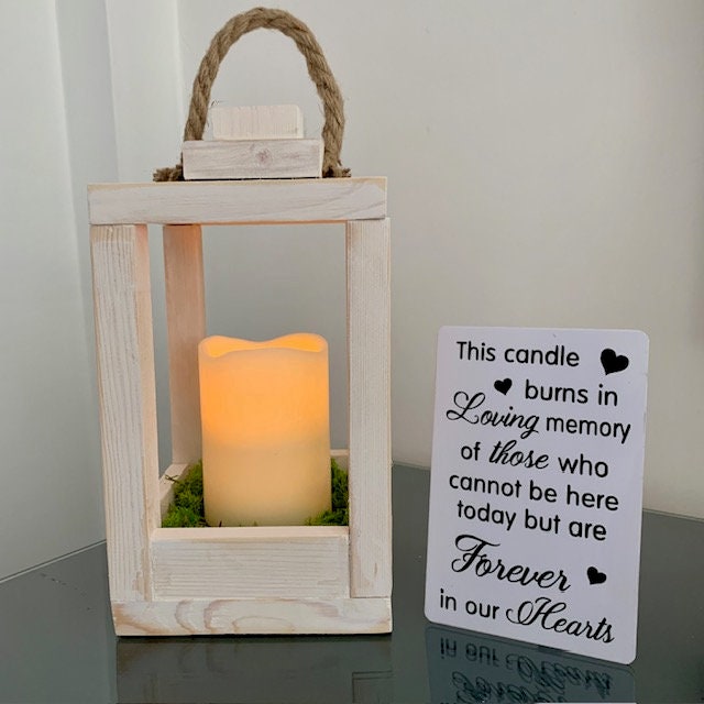 Memorial Lantern, This candle burns in loving memory of those who cannot be here today but are forever in our hearts. Rustic Wooden Lantern.