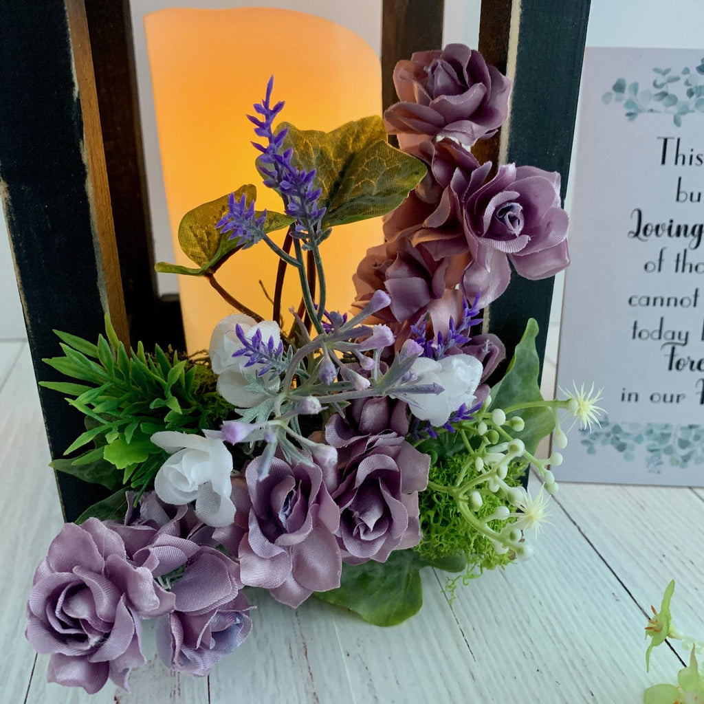 Inside the wooden lantern stands a battery operated orange flicker candle (BATTERIES NOT INCLUDED). The front has an array of purple and white silk flowers and complimenting foliage. Reindeer moss finishes the design.
