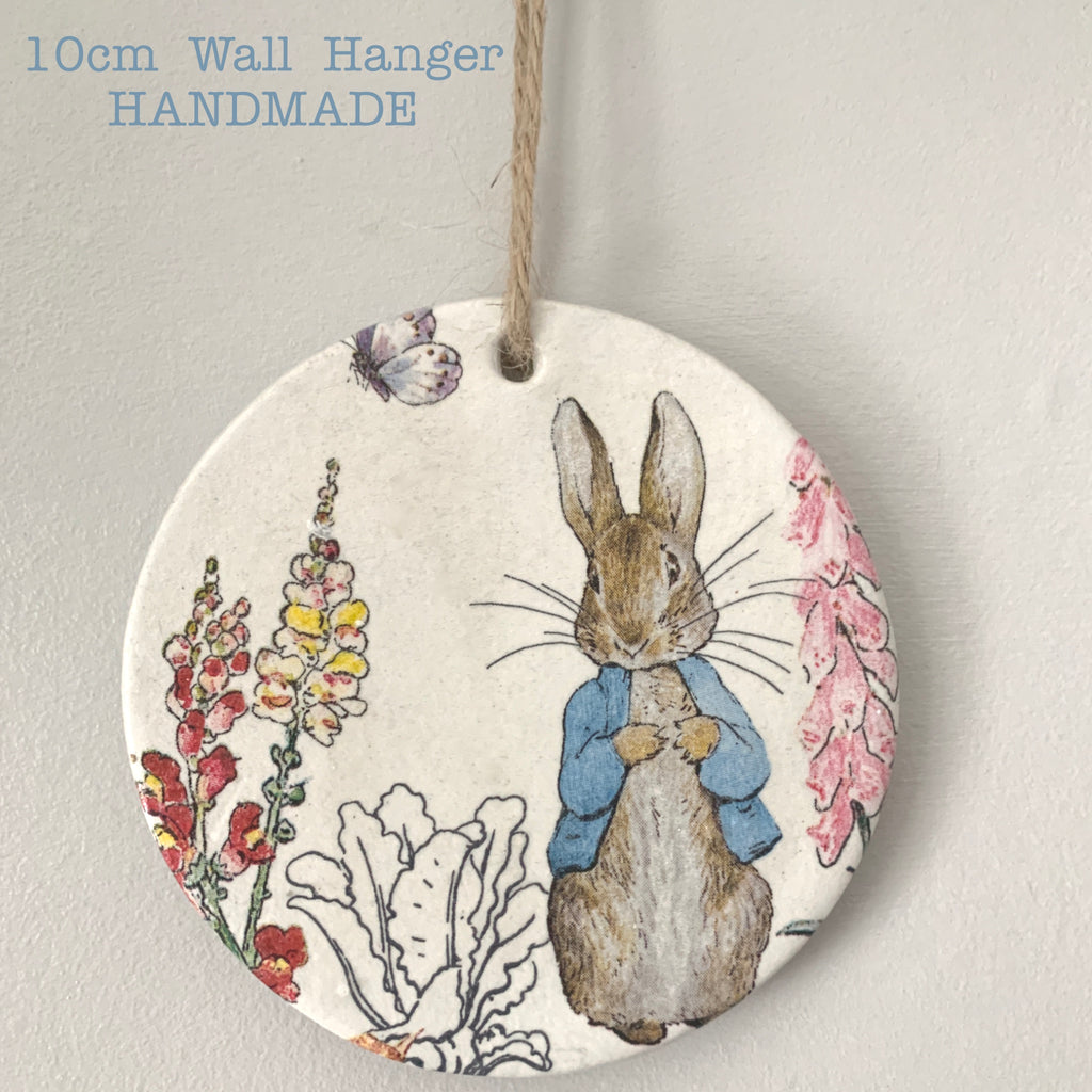 Item Description Handmade Peter Rabbit wall hanger, measures 10cm diameter with a jute string hanger. Beautiful wall decoration for any child’s nursery or bedroom.