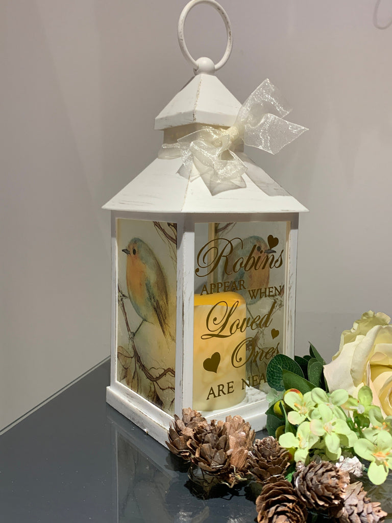 Offer comfort and remembrance with this beautiful memorial lantern. Featuring the heartfelt message "Robins Appear when Loved Ones are Near," this lantern serves as a gentle reminder of those we've lost. It’s the perfect bereavement gift, helping to soothe the hearts of those grieving during difficult times. Suitable for use indoors or outdoors, this lantern can light up any space with a soft, warm glow, providing solace and reflection.