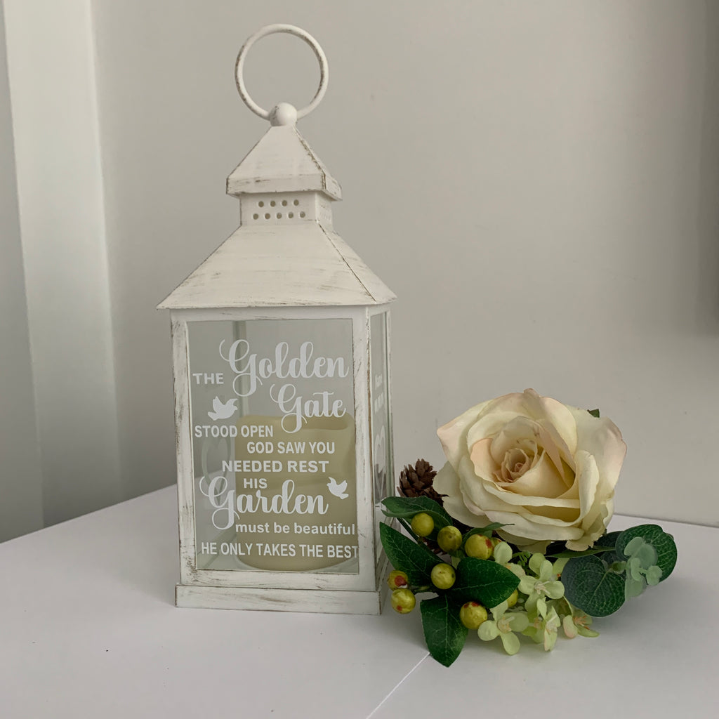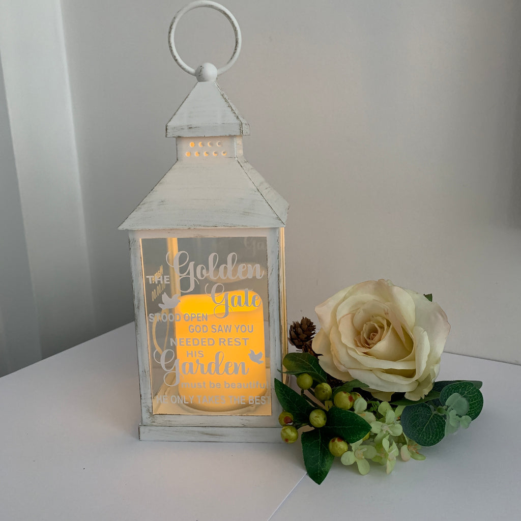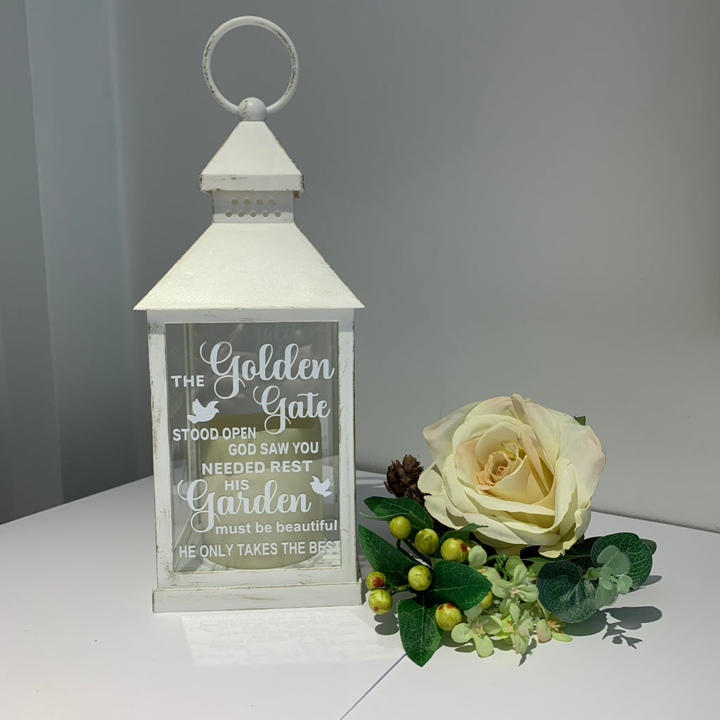 The Golden Gate stood open, god saw you needed rest, his garden must be beautiful, he only takes the best. This gorgeous memorial lantern has the quote on the front and room either side to add names and dates.