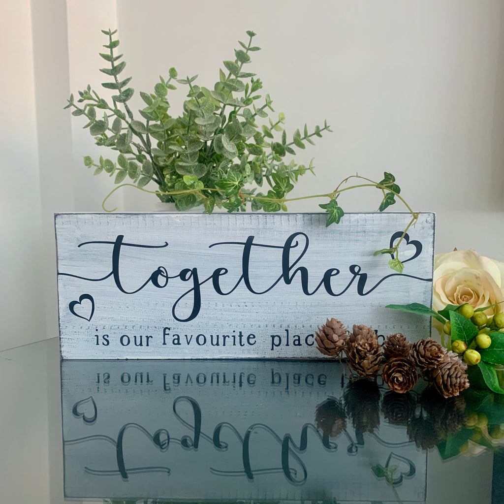 Together is our favourite place to be. Wooden sign. Home decor, 29 cm x 11.50 cm, painted wooden sign, freestanding sign. Moving in Gift. A very popular inspirational saying so would make a lovely Birthday Gift, Christmas Gift or Moving in/New Home Gift.