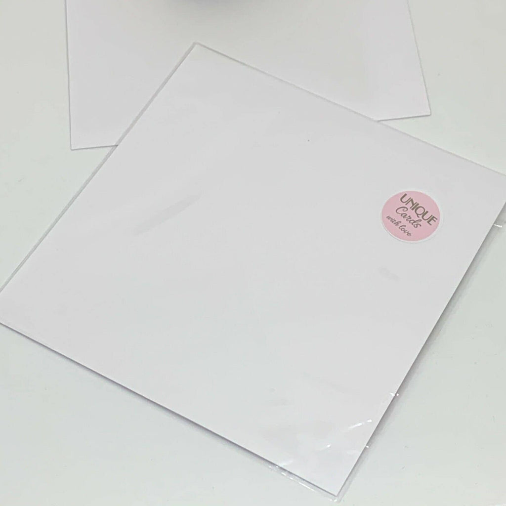 This card measures 6" x 6" (260gsm) white card - blank inside. Comes complete with envelope.