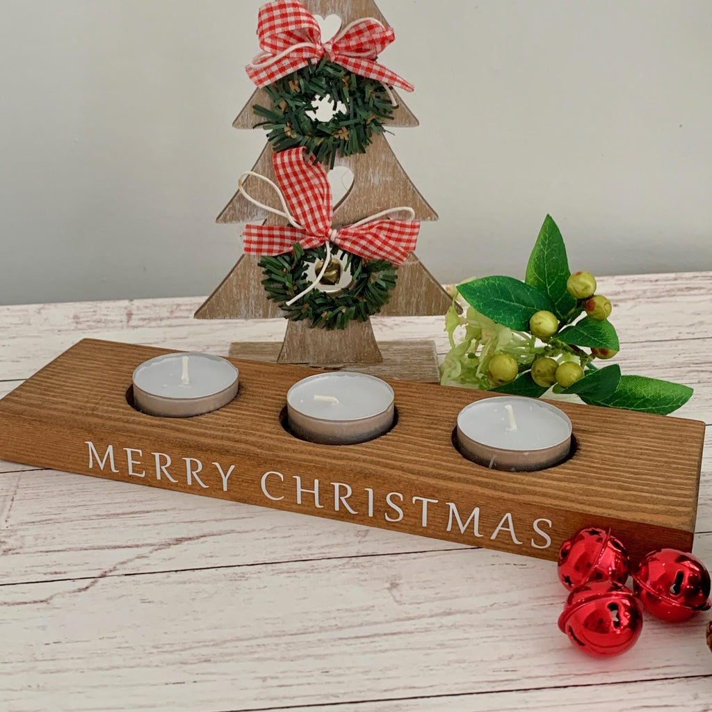 This beautiful Wooden tea light holder houses 3 tea light candles which are included. Comes with Merry Christmas on the front. Has been stained with a rich looking Autumn Brown colour.