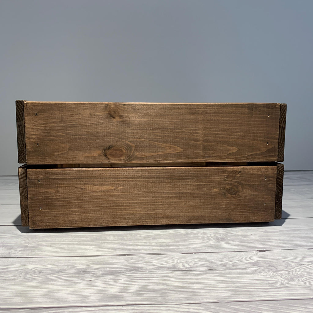 Sturdy crate finished in a walnut long lasting stain. Measures 23x31x15 cm approximately