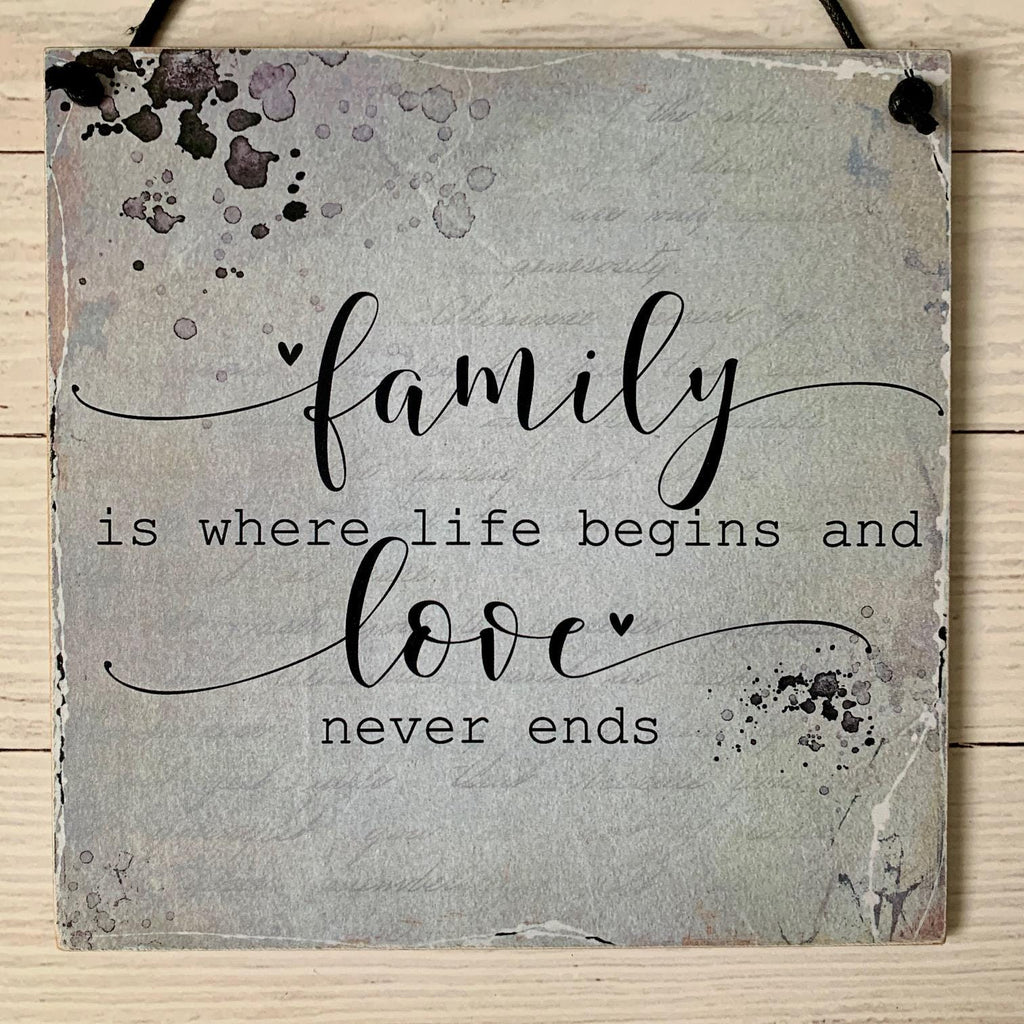Family is where life begins and Love never end, wall hanger, home decor, wooden sign, 15 cm x 15 cm. Handmade.