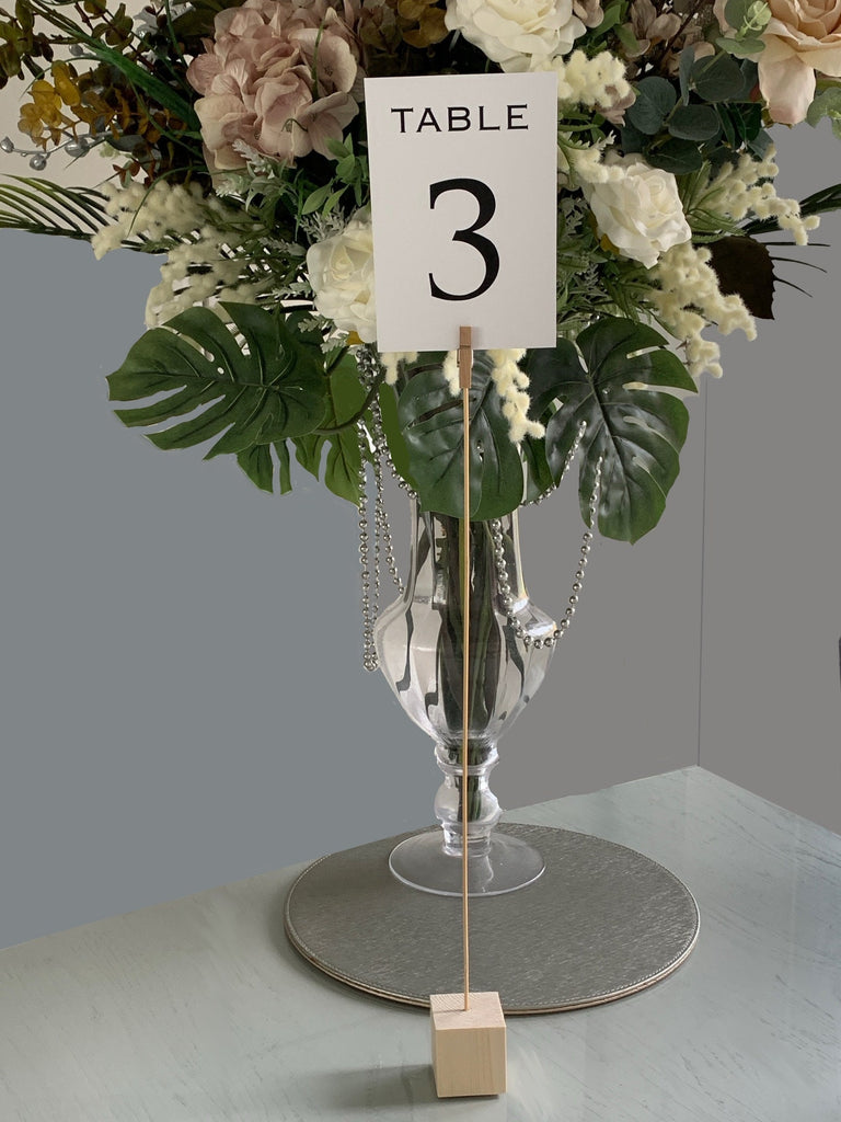 This listing gives you the complete table decoration from the printed table numbers (option to personalise) the wooden block stand and the stem with peg to hold the number cards.